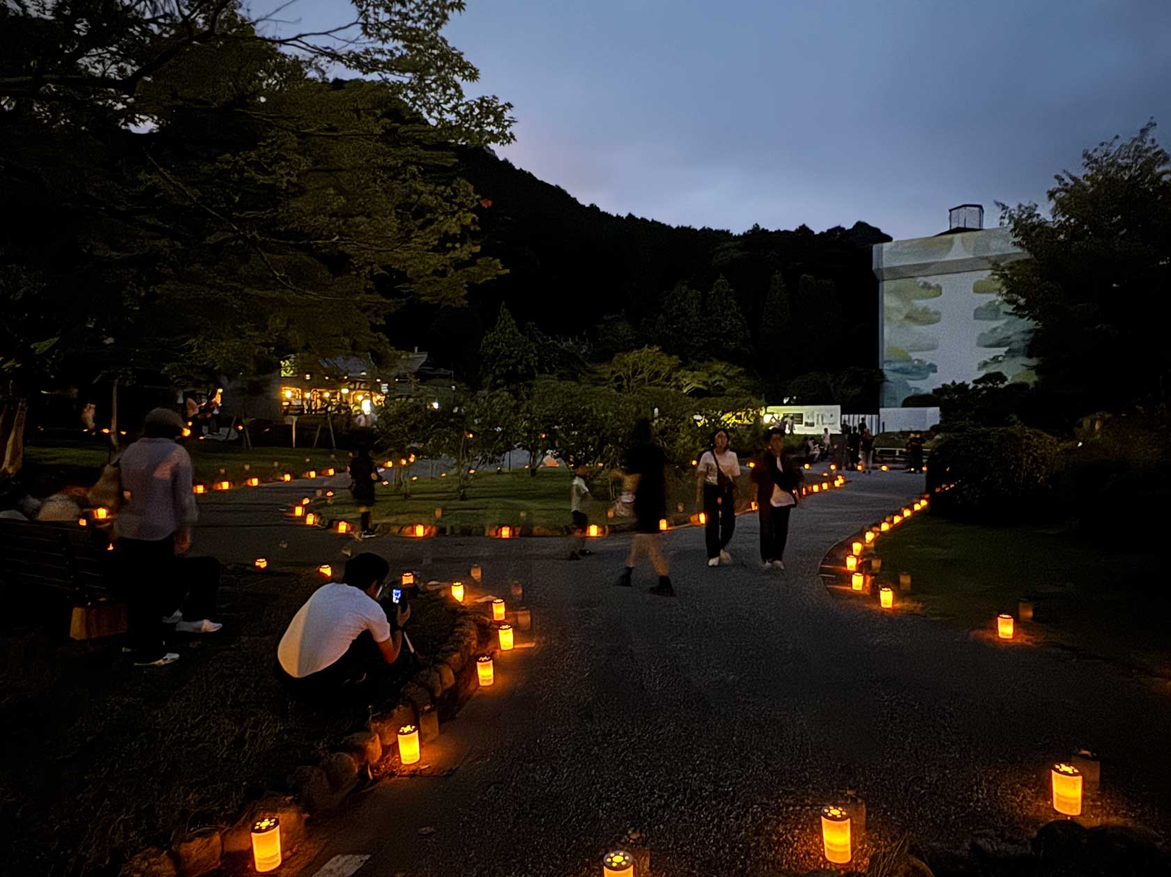 キャンドルの点灯は、両日とも午後6時半から9時まで。並べられた約1000個のフローティングキャンドルに、約200人のボランティアスタッフが5時頃から火をともしていく。催しの名称「ゆらめき回廊」は、風で揺れるキャンドルの様子から名付けられたという。
