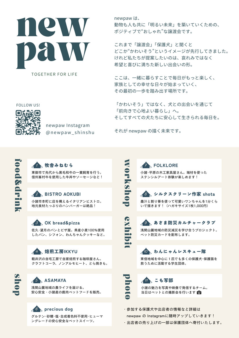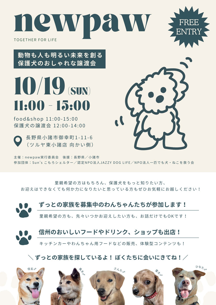 10/19(日)『newpaw 犬の譲渡会』初開催!東信地域のフード・ショップ・ワンちゃんと楽しめるお店などが出店するマルシェも♪@長野県小諸市