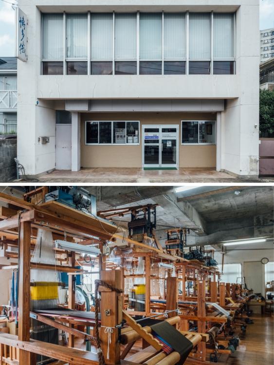 福岡市博多区比恵町にある博多織デベロップメントカレッジ(博多織DC)。約20台の織機が並ぶ工房では、若い学生たちが真剣な表情で手織りに取り組んでいる。