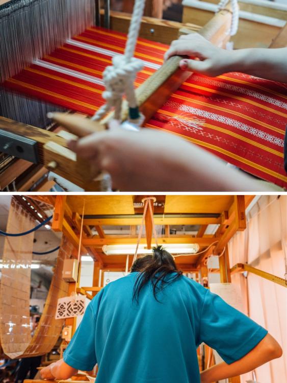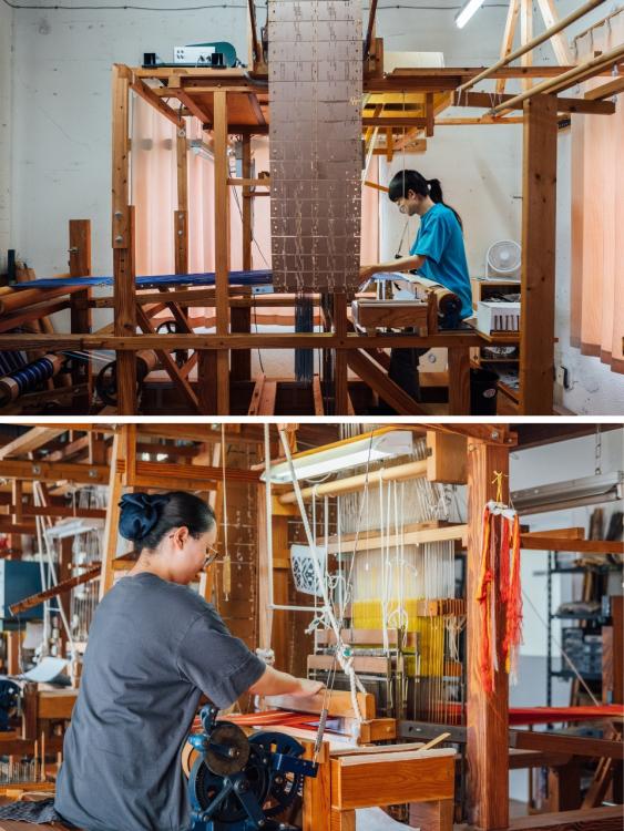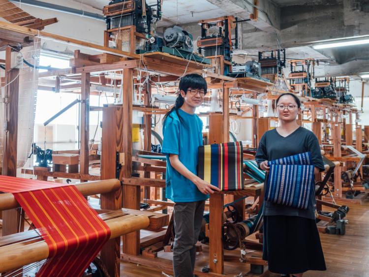 工房では、学生たちが両手と両足を使って織機を操作している。緯糸を隙間に通し、交互に投げ入れていく基本作業。一見単純に見えるが、その技術習得は想像以上に奥深い。