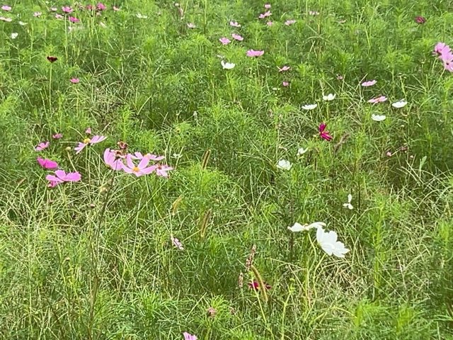 確かに遠巻きに外から見てるだけでも、いろいろな仕掛けが施されたコスモス園のようで、コスモス以外の花々も楽しめる様子。