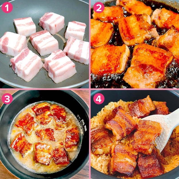 ① フライパンにごま油を引き、豚バラブロック肉を入れて中火で焼き目がつくまで加熱する。