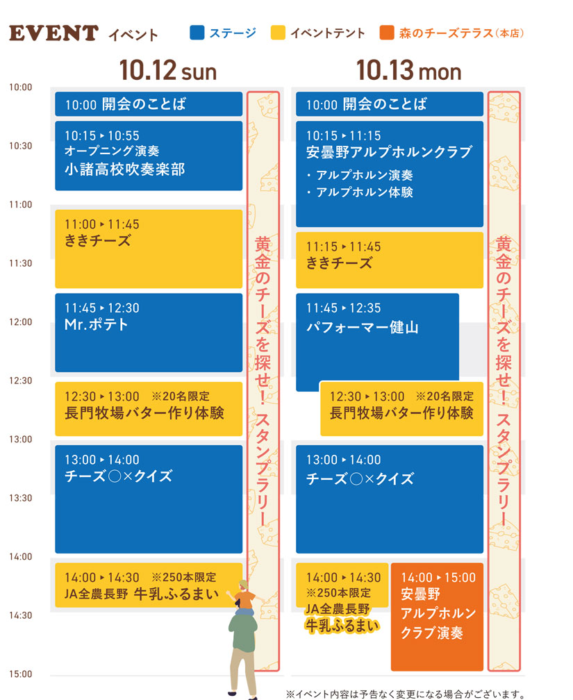 会場ではスタンプラリーやクイズなどのチーズにまつわるイベントをはじめ、「安曇野アルプホルンクラブ」による演奏・体験なども楽しめます。