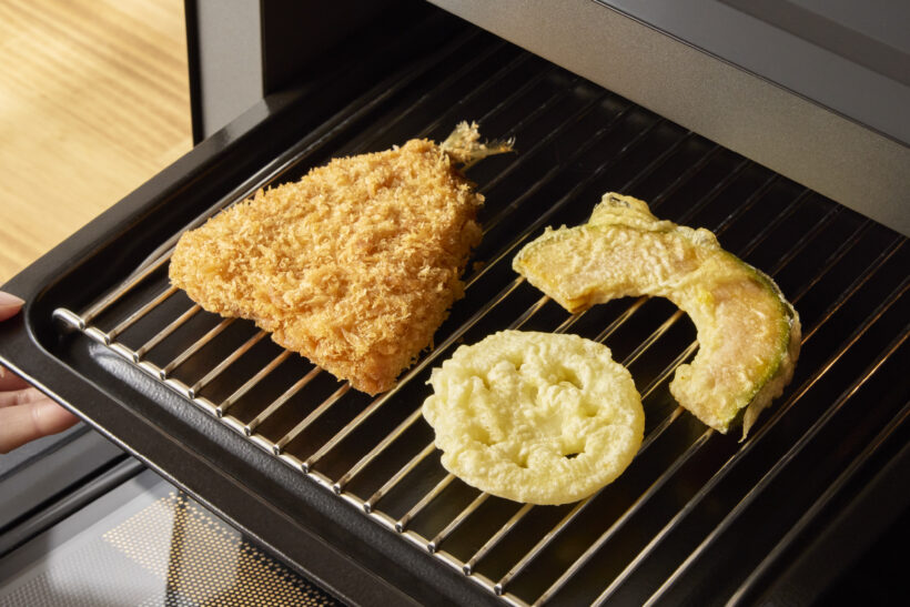 同製品は、揚げ物と焼き物をおいしく温める新機能「リフライモード」と「リグリルモード」を搭載。レンジ対応のセラミック天板に重ねた網に食材を乗せて調理をスタートさせると、選択したモードに合わせてレンジ加熱とオーブン加熱がオートで切り替わり、「食材の中まであつあつに、外側は裏までサクサク」(プレスリリースより)に仕上げるという。