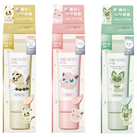 有効成分ナイアシンアミド配合で美白*¹・シワ改善・肌あれ防止効果のある「ミネラル 薬用プライマーベース」には、カラーごとにプリン、ミミッキュ、ニャオハが登場します。