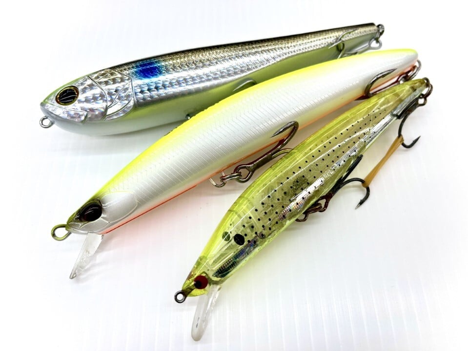 サヨリパターンで。クロスかダウンへ投げてスローに巻き引き波を立てる。ホログラムやメッキ系がオススメ