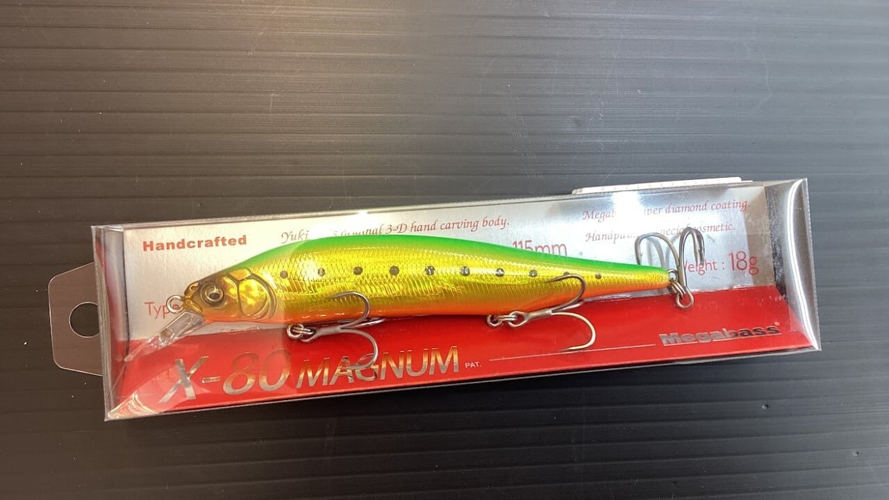 飛距離の出るブレードジグ。40gと60gが人気。イワシカラーがオススメ。サワラにも効く。シーバスにはスローにサワラには速巻きで。X-80 マグナム(メガバス)