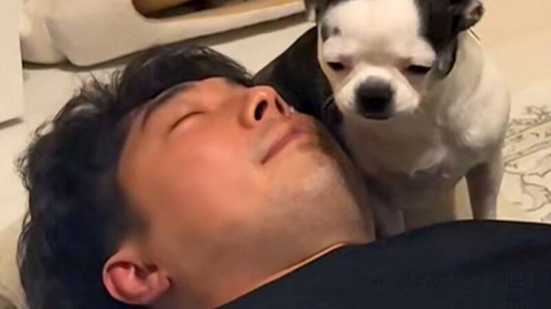 すると突然『イテッ!』という声とともに起き上がったパパ。ホリホリの衝撃で髪の毛が抜けてしまったとか…。おかまいなしのわんこたちは一斉に「おはよう!」「起きた?」と怒涛のご挨拶!