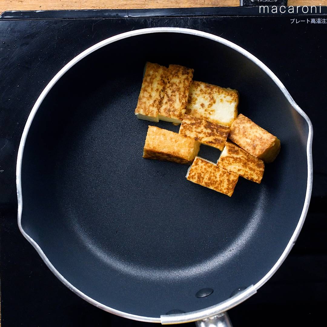 1: フライパンに厚揚げを並べ、表面に焼き色がつくまで中火で焼きます。