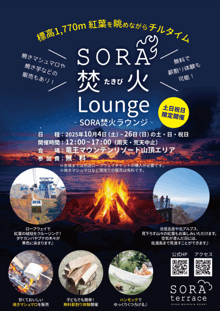 標高1770mの竜王マウンテンリゾート・山頂エリアで、焚き火(たきび)を囲みながら、ゆったり・まったりするイベントが土日・祝日限定で開催されます。ちょうど紅葉のシーズン。色づく山を眺めながら、焚き火にあたったり、ハンモックやアウトドアチェアでくつろいだり。マシュマロやスモア、焼き芋の販売もあります。子どもでもできる薪割り体験も!手軽にアウトドア体験ができる機会です。※会場まではロープウェイチケットの購入が必要です。