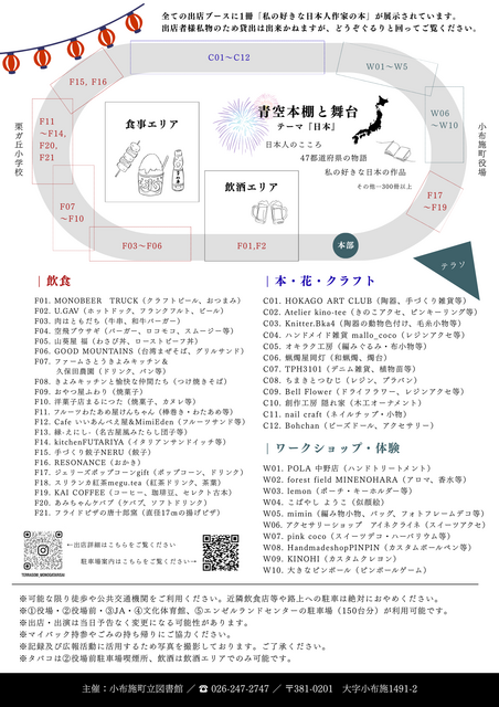 「小布施町立図書館まちとしょテラソ」を中心としたマルシェイベントです。図書館の年に一度の祭典で、今年は『日本』をテーマに、日本人のルーツに思いを馳せる本を選んで「青空本棚」に用意。マルシェでは美味しいフード&ドリンク、一点物のクラフトなどが並びます。10時には野点によるお抹茶と干菓子が、14時にはつきたてのお餅が先着順でふるまわれます!