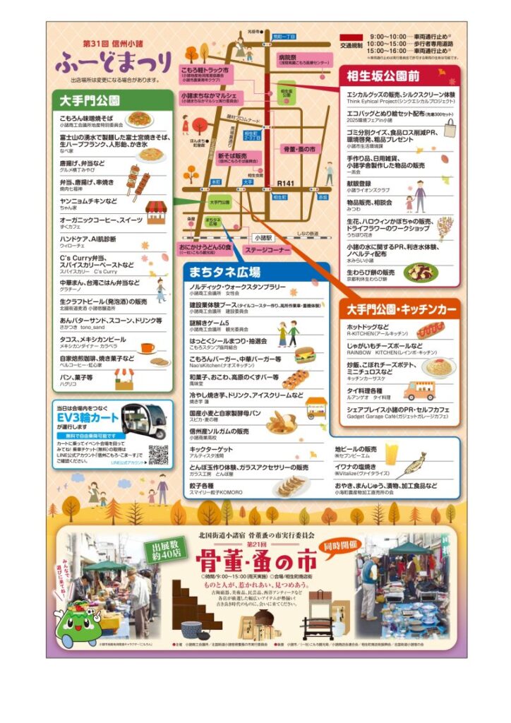 美味しいものを食べて小諸の秋を感じてもらおうというイベントです。会場は相生町商店街や大手門公園で、「こもろん味噌焼きそば」などの飲食販売、謎解きゲーム、スタンプラリーなどがあります。ゴスペル、ダンス、Jポップバンドなどのステージも。さらにこの日は、『第21回 骨董・蚤の市』『小諸まちなかマルシェ』『第16回こもろ軽トラック市』『第46回浅間南麓こもろ医療センター病院祭』も同時開催とイベントが盛りだくさん。賑やかな一日になりそうです。