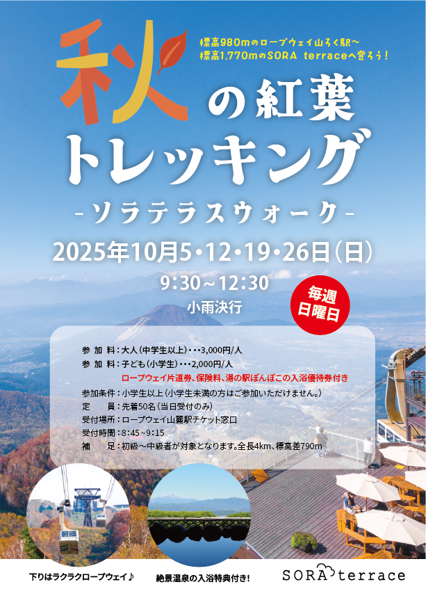 こちらも竜王マウンテンリゾートのイベント。標高980mのロープウェイ乗り場(山麓駅)から標高1770mの「SORA terrace」まで、紅葉を楽しみながら、ゆっくり登っていきます。参加料には帰りのロープウェイ料金が含まれているほか、「湯の駅ぽんぽこ」入浴優待券もプレゼント!トレッキングの疲れを温泉にゆっくり浸かって癒すことができます。