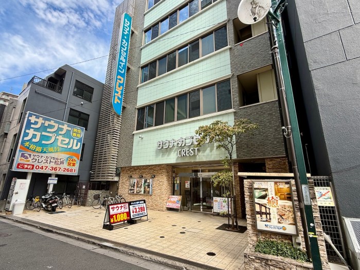 松戸駅といえば、上野駅へ約20分・東京駅へ約25分・品川駅へ約35分。都内で働くビジネスマンはもちろん、東京観光の拠点にもなる便利な駅。そんな松戸駅の西口から歩いてスグの場所にあるのが、泊まれるサウナ「クレスト松戸」だ。