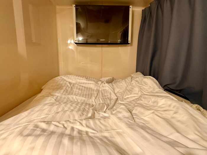 そんなわけでカプセルへ。部屋はカーテンで仕切られているだけだから防音性はほぼゼロ。廊下を歩く音も聞こえるくらいだから、音に敏感な人は耳栓を用意しておくべし。
