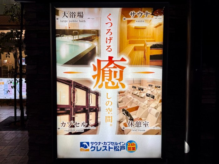 歩道橋(ペデストリアンデッキ)を降りてスグに現れるのが「クレスト松戸」。看板には「大浴場・サウナ・カプセル・休憩室──くつろげる癒しの空間」と書いてあった。サラリーマンの天国ここにあり。