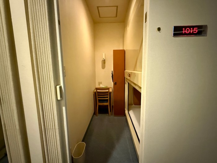 さて、チェックインを済ませたら個室カプセルへ。部屋はアコーディオンカーテンで仕切られているだけなので鍵はかけられない。荷物・貴重品はロッカーに入れておく必要がある。