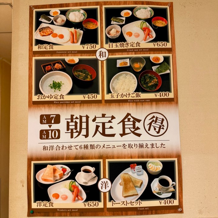 朝風呂でスッキリ目覚めてから、4階レストランで朝食を食べることに。朝7時から10時まで和洋合わせて6種類の朝食メニューを提供しているようだ。