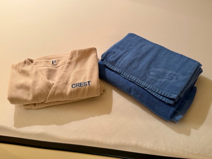 ロッカーには館内着とタオル(大1枚・小2枚)が用意されているので、館内着に着替えてタオルを手に取りエレベーターで5階の大浴場へ。