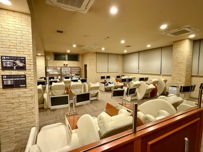 入浴後に館内をひと通り見学することに。休憩室(4階・地下1階)にはリクライニングシートがズラリと並び、テレビや漫画も見放題。Wi-Fiや電源もあるので、仮眠や作業スペースとしても使えそうだ。